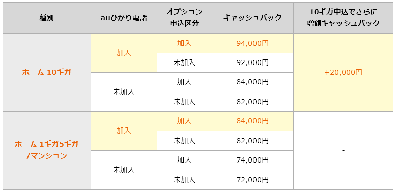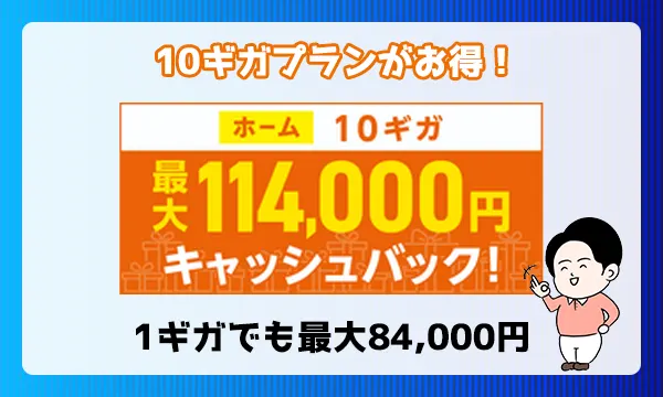 また、高速サービス10ギガを申し込むと、キャッシュバックが20,000円増額となるので10ギガプランなら最大114,000円キャッシュバックとなります。