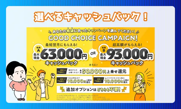 - 特典A:キャッシュバック63,000円(最短翌月受け取り)