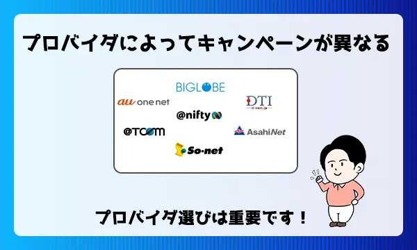 ただし、選択するプロバイダによってはキャッシュバックがもらえなかったり割引が無いなど、窓口によって選択するプロバイダによって異なります。