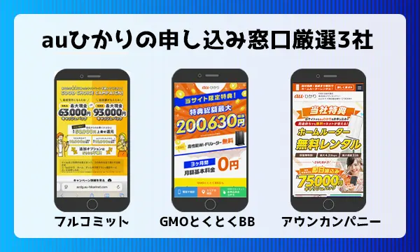 このページでは、多くのauひかり申し込み窓口の中から特におすすめな窓口を3つに絞って紹介していきます。
