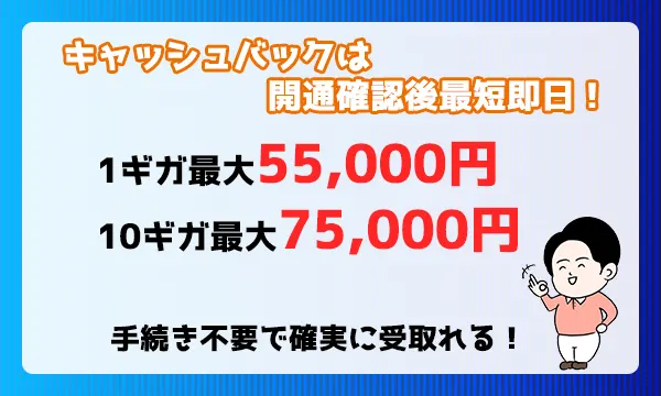| キャッシュバックの受取り時期 | 4カ月後と12カ月後 | 12カ月後と24カ月後 | 開通確認後最短即日 |