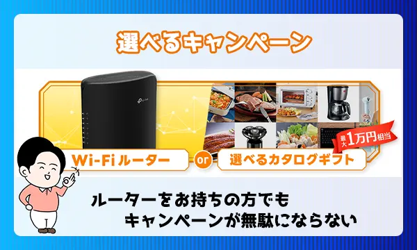 | 窓口キャンペーン | – | 3カ月月額料金無料 Wi-Fiルータープレゼント | Wi-Fiルーターまたは カタログギフトプレゼント |