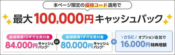 上記特設ページ限定!最大100,000円キャッシュバック!さらに、10ギガプランは半年間、月額500円で利用可能!!