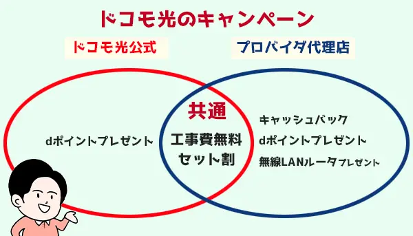 ドコモ光のキャンペーンは、ドコモ光の公式が行うキャンペーンと、代理店やプロバイダなど申込窓口が行うキャンペーンに分かれています。
