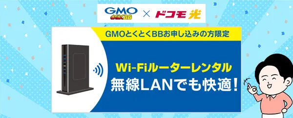 なお、GMOとくとくBBのドコモ光は、キャッシュバック以外に、「v6プラス対応Wi-Fiルーター無料レンタル」「開通前モバイルWi-Fiルーター無料レンタル」等、特典も豪華です。
