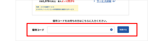 鬼安キャンペーンのサイトから申し込みフォームに進み、プラン選択ページの下部に「優待コード」入力欄があるので【XQVT】と入力し、「利用する」を押します。