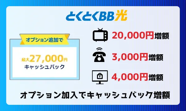 GMOとくとくBB光の申し込みと同時に、指定のオプションサービスに加入するとキャッシュバックが増額となります。