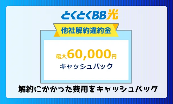 GMOとくとくBB光では、他社のネットから乗り換える際に解約にかかった費用を最大60,000円までキャッシュバックする「他社解約違約金還元」のキャンペーンをが適用になるので、解約にかかる費用を気にすることなくGMOとくとくBB光に乗り換えできます。