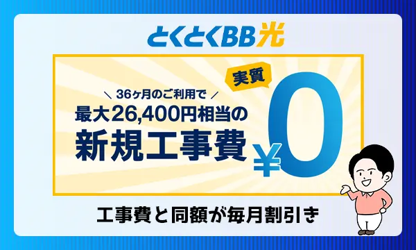 GMOとくとくBB光は工事費実質無料キャンペーンを行っていますが、工事費が無料になるわけではなく、工事費を分割払いにした時と同じ金額がGMOとくとくBB光の月額基本料金から割引になります。