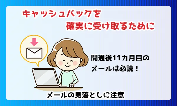 メールを見落とさないように、カレンダーに印をつけたりリマインダーの設定をするなど工夫をして、メールが送られてくるのを忘れないようにしてください。 - キャッシュバックの申請は期日以内に