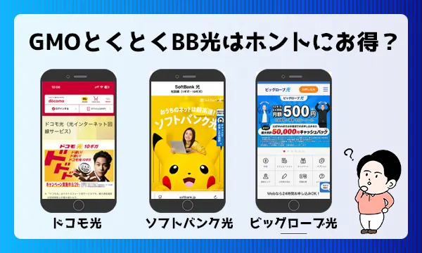 ここで上げたドコモ光、ソフトバンク光ビッグローブ光はそれぞれスマホとのセット割が適用になるので、セット割が適用になれば家庭の通信費で比較すると、GMOとくとくBB光よりもお得になることもあります。