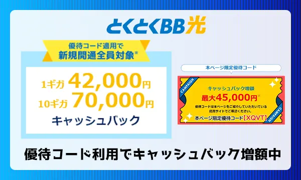 ※優待コードの利用で、1ギガプランは17,000円増額の42,000円キャッシュバック、10ギガプランは45,000円増額の70,000円キャッシュバックです。