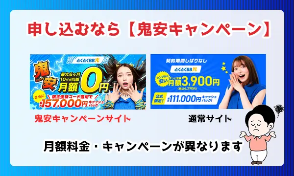 しかし、GMOとくとくBB光は通常の申し込み窓口の他に、キャンペーンや月額料金が異なる鬼安キャンペーンのページが用意されています。