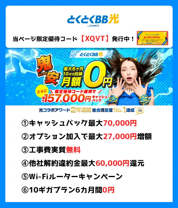 | 適用条件 | ・GMOとくとくBB光の鬼安キャンペーンのページからGMOとくとくBB光を申し込むこと ・GMOとくとくBB光が指定した方法でキャッシュバックの申請手続きを行なうこと ・申し込み画面で【XQVT】を入力すること |