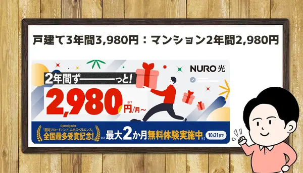 NURO光の月額料金が戸建てで3年間、マンションで2年間、基本料金が割引になります。