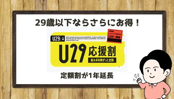 U29応援割は29歳以下の方がキャンペーン期間中にNURO光を申し込むと、「戸建て3年定額割:マンション2年定額割」の割引期間が1年間延長されます。