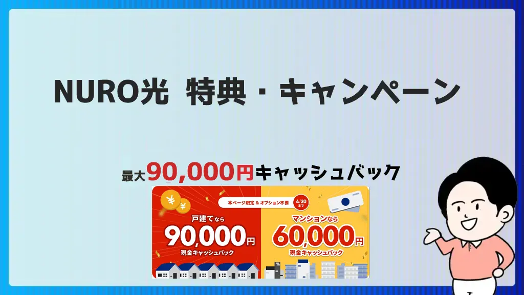 NURO光のキャンペーンは90,000円キャッシュバックがもらえたり、月額料金が1年間980円にて利用できる特典・キャンペーンを開催しております。