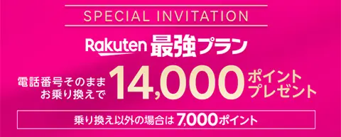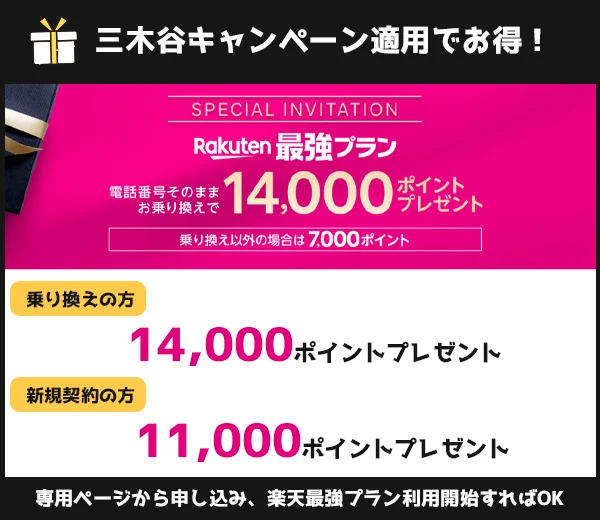 | Rakuten最強プランはじめてお申し込み特典 | Rakuten最強プランに初めて申し込みで7,000ポイントもらえる ※三木谷キャンペーンとの併用不可 | |
