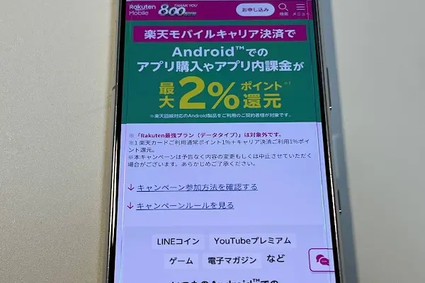 | 楽天モバイルキャリア決済ポイント還元キャンペーン | 楽天モバイルキャリア決済を利用すると、支払った金額の最大2%分のポイント還元 | |