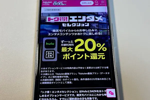| エンタメコンテンツがおトクに楽しめる!トク得!エンタメセレクション | hulu20%ポイント還元、DAZN15%ポイント還元など、お得にエンタメコンテンツ視聴可能 | |