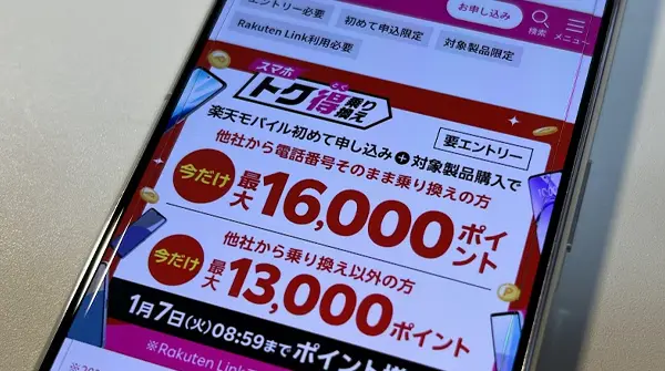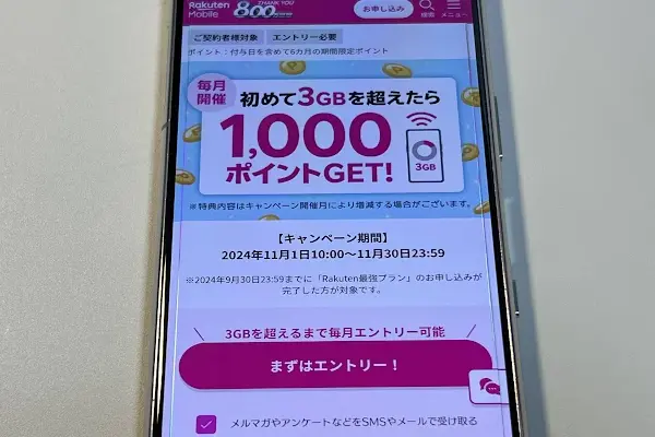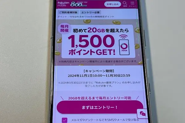 楽天モバイルの一部キャンペーンでは、エントリーが必要となっており、未エントリーの場合は特典を受け取れないこともあります。