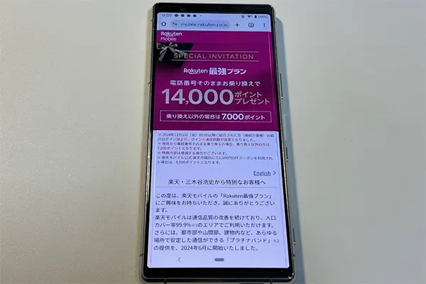 三木谷キャンペーンでは、乗り換え(MNP)の方は14,000ポイント、新規の方は7,000ポイントもらえるお得な内容になっております。