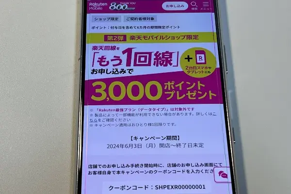 | 【ショップ限定】楽天回線もう1回線申し込みでポイントがもらえる | 楽天モバイルショップにて、もう1回線申し込むと3,000ポイントがもらえる ※クーポンコード:SHPEXR00000001 | |