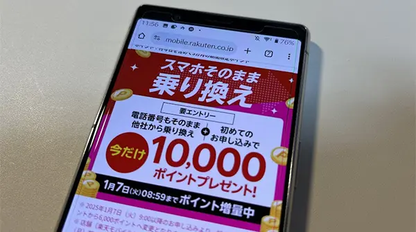 他社から楽天モバイルへ乗り換え(MNP)を行うと、10,000ポイントもらえます。