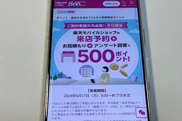 | 【ショップ限定】来店予約&店頭でお見積もり&アンケートに回答でポイントがもらえる | 楽天モバイルショップにて条件を満たすと、500ポイントがもらえる ※施策コード2394 | |