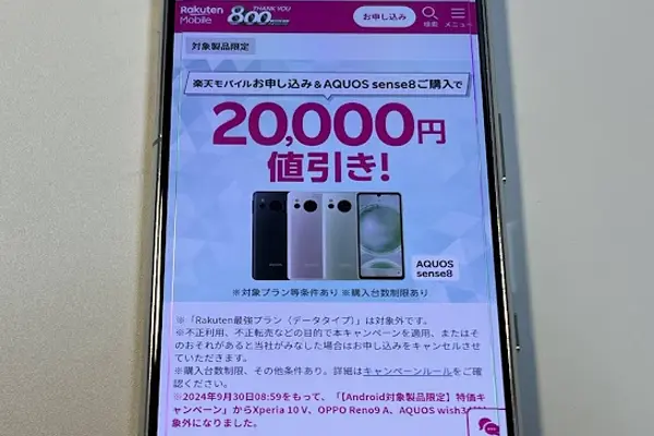 | 楽天モバイル申し込み&対象製品購入で最大20,000円値引き! | 対象製品(AQOUS Sesnse 8)が20,000円割引で購入可能 ※2回線目以降も対象 | |