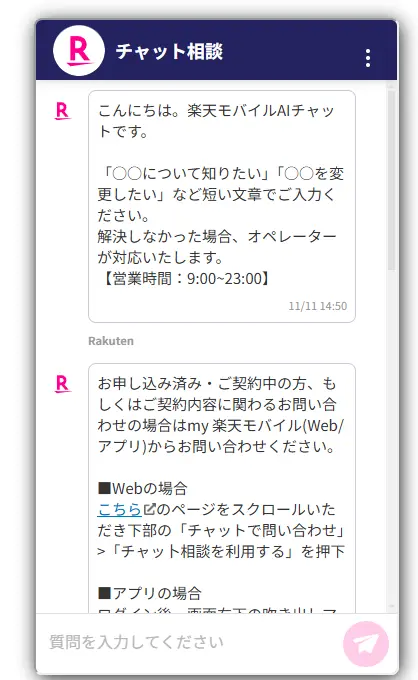 調べてもわからない場合は、楽天モバイルの公式サイトのチャット相談より確認をすることも可能です。