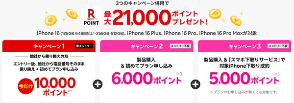 | iPhone 16キャンペーン | iPhone16シリーズ購入で最大21,000ポイントもらえる。※条件あり | |