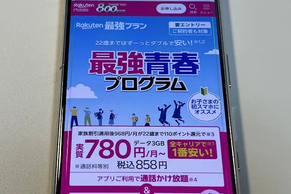 楽天モバイルでは、学割はありませんが、最強青春プログラムという、22歳まで対象の学割のようなプログラムが用意されています。