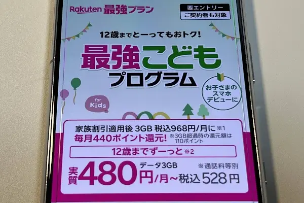 楽天モバイルではこども(12歳まで)を対象にした、最強こどもプログラムを用意しています。