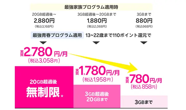 さらに、家族割(最強家族プログラム)と併用することで、3GBは実質858円、20GBは実質1,958円、20GB以上は実質3,058円という、かなり安い料金で利用できます。