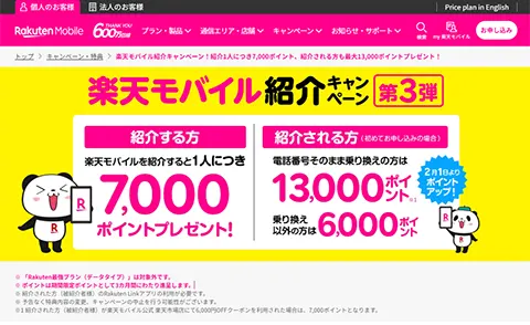 | 楽天紹介キャンペーン | 紹介キャンペーン経由で楽天モバイルに乗り換えの方は13,000ポイント、新規は10,000ポイントもらえる ※専用ページからの申し込み必須 | |