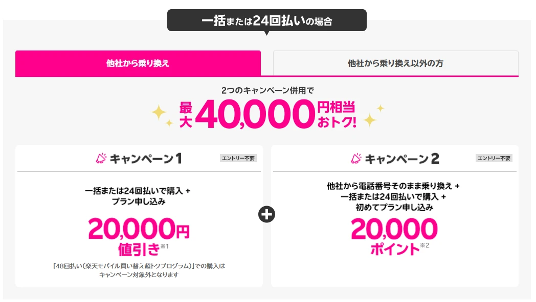 - 楽天モバイル申し込み&対象製品購入で最大20,000円値引き!