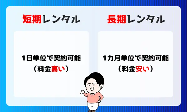 短期より長期の方が1日当たりの料金が安くなりますが、月単位での契約のため、数日・数週間利用するという人には長期レンタルサービスは向いていません。